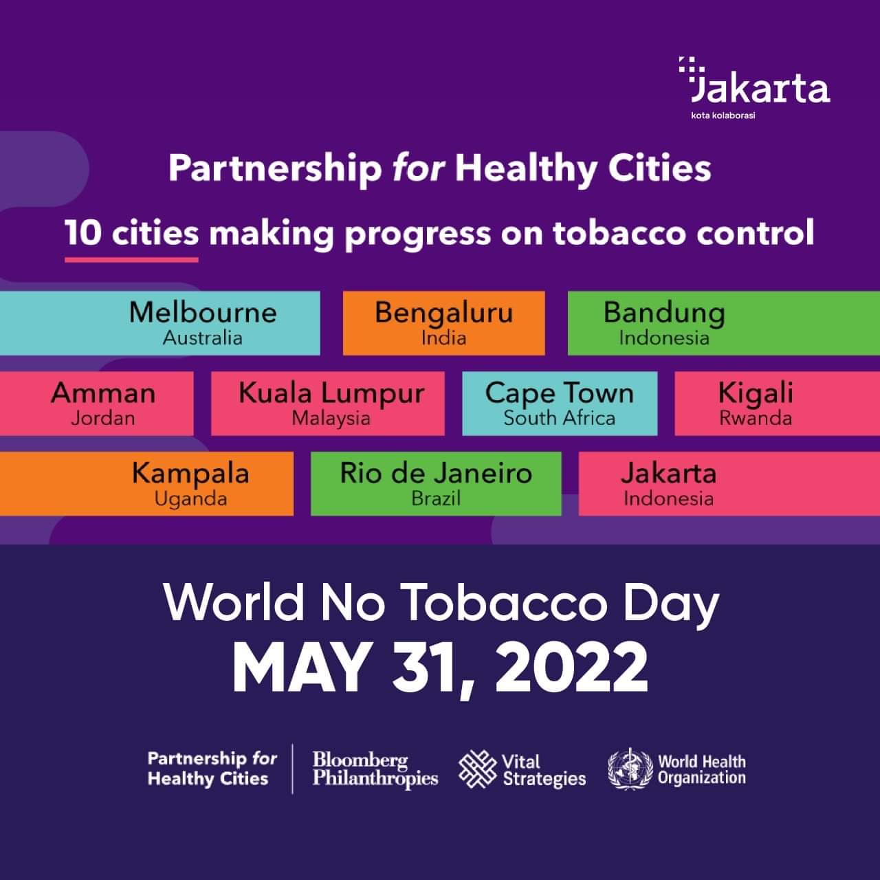 Sebagai bagian dari Kemitraan Kota Sehat, Jakarta memperingati Hari Tanpa Tembakau Sedunia dengan berkomitmen dalam pencegahan kanker dan penyakit tidak menular lainnya yang disebabkan oleh konsumsi r ...