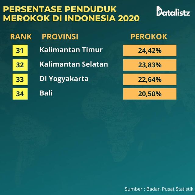 Menurut laporan Survei Sosial Ekonomi Nasional (SUSENAS) pada tahun 2020, Provinsi Lampung memiliki persentase penduduk merokok tertinggi di Indonesia, dimana 33,4% penduduk Lampung yang berusia diata ...