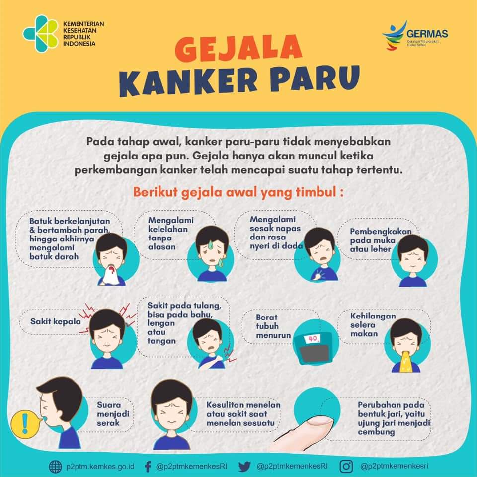 Pada tahap awal kanker paru-paru tidak menyebabkan gejala apapun. Gejala hanya akan muncul ketika perkembangan kanker telah mencapai suatu tahap tertentu.